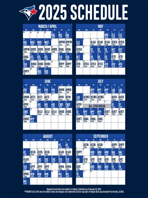 Another great tip is to use your schedule to track the team’s progress . After each game, jot down the score and any key highlights. This will help you follow the team’s performance throughout the season and see how they’re doing against their rivals. You can also use your schedule to keep track of player stats or any notable achievements. This will make you an even more informed and engaged fan. Don’t be afraid to get creative with your schedule. Use it as a scrapbook or a memory board. Add photos, ticket stubs, or other mementos to commemorate special games or moments. This will turn your schedule into a unique keepsake that you can cherish for years to come. Finally, remember to check your schedule regularly for any changes. Game times and dates can sometimes shift due to weather or other unforeseen circumstances. Stay updated so you don’t miss any of the action. With these tips, you’ll be able to use your printable Blue Jays schedule effectively and enjoy every moment of the 2025 season. Go Jays go!