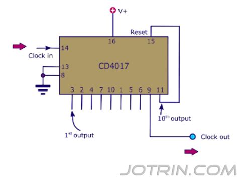 Now that we know what the CD4017B IC does, let’s get down to the nitty-gritty: how do we actually use it? Understanding the pinout is absolutely crucial. The CD4017B typically comes in a 16-pin Dual In-line Package (DIP), making it breadboard-friendly. Let’s break down each pin and its function, so you can start building your projects with confidence. Remember, always refer to the datasheet for the most precise information, but this guide will give you the essential overview. First off, we have the power supply pins: VCC (Pin 16) and GND (Pin 8) . You must connect VCC to your positive voltage supply (usually between 3V and 18V) and GND to ground. This is non-negotiable for the chip to work! Next, let’s talk about the inputs that control the counting. The most important one is the Clock Input (CLK, Pin 14) . This is where you feed the pulses that make the CD4017B count. Each rising edge (transition from LOW to HIGH) on this pin advances the counter to the next state. Then we have the Clock Enable (CE, Pin 13) . When this pin is tied LOW (to GND), the clock input functions normally. If you pull it HIGH, it disables the clock, and the counter holds its current state. This is super handy for pausing your sequence. We also have Reset (R, Pin 15) . This pin is key for controlling the count cycle. When you apply a HIGH pulse to the Reset pin, the counter is reset to its initial state, which is usually 0 (meaning Q0 becomes HIGH). Tying this pin LOW allows the counter to operate normally. You can use this to make your sequence repeat continuously or to reset it manually. Now for the outputs: the CD4017B has 10 decoded outputs: Q0 through Q9 (Pins 3, 2, 4, 7, 10, 1, 5, 6, 9, 11 respectively) . These are the pins that go HIGH one by one as the counter increments. Typically, you’ll connect LEDs (with appropriate resistors!) to these pins to visualize the counting sequence. Finally, we have Carry Out (CO, Pin 12) . This output is HIGH when the counter is in state 9 (Q9 is HIGH) and the next clock pulse arrives, causing the counter to roll over back to 0. It’s essentially an indicator that a full decade cycle has completed. It’s often used to cascade multiple CD4017Bs together to create counters that go beyond 10. So, to recap a basic setup: connect VCC and GND, feed clock pulses to CLK, tie CE and R to GND for continuous counting, and use Q0-Q9 to drive your LEDs or other outputs. It’s really that straightforward to get started! Connecting these pins correctly is the first step to unlocking the potential of the CD4017B.