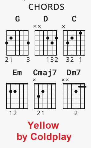Before we dive into the strumming pattern, let’s quickly review the chords you’ll need to play “Yellow.” The song primarily uses four chords: