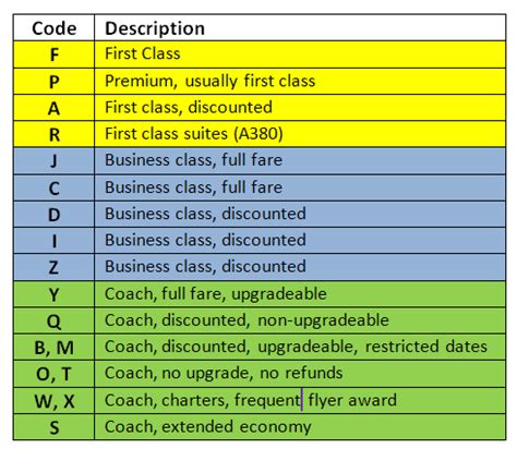 • F, A: Usually represent first class fares . ‘F’ is often the full-fare, highest-priced first-class ticket with maximum flexibility. ‘A’ might be a discounted first-class fare, still luxurious but with some potential limitations.