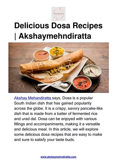 So there you have it, folks! We’ve journeyed through the fascinating history, the magical batter, the endless varieties, the perfect pairings, and the global appeal of dosa . This humble dish from South India is truly a culinary marvel – versatile, delicious, healthy, and endlessly adaptable. Whether you’re a beginner looking to try your first plain dosa or an experienced cook ready to experiment with creative fillings, there’s a whole world of dosa adventures waiting for you. Remember the key tips for making it at home: a well-fermented batter, a properly heated griddle, and a bit of practice with the spreading technique. Don’t be afraid to get creative with your fillings and accompaniments, and embrace the fact that dosa is naturally gluten-free and easily vegan – a win-win for many! So, what are you waiting for? Head to your kitchen, gather your ingredients, and start your own dosa-making journey. Explore the different types, try new combinations, and share the joy of this incredible dish with your friends and family. Your taste buds will thank you! Happy cooking, and may your dosas always be crispy and delicious!