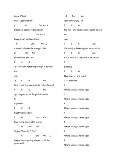 Exploring chord variations can significantly enhance your playing and add depth to the song. Instead of just sticking to the basic major and minor chords, try incorporating seventh chords, sus chords, or even altered chords. A seventh chord adds a seventh interval to the basic triad, creating a richer and more complex sound. For example, you could try playing a Cmaj7 instead of a C major. Sus chords, such as sus2 and sus4, create a suspended sound by replacing the third of the chord with a second or fourth. This can add a sense of tension and release to the music. Altered chords, such as augmented or diminished chords, can add a dissonant and unsettling sound. These chords are often used to create tension or to add a dramatic effect. You can also try playing different inversions of the chords. An inversion is when you change the order of the notes in the chord. This can change the bass note and the overall feel of the chord. For example, you could try playing a C major chord with the E in the bass instead of the C. This is called a first inversion C major chord. Experiment with different chord variations and see what sounds best to you. The key is to use your ear and trust your instincts. Don’t be afraid to break the rules and try new things. The goal is to create a sound that is unique and expressive.
