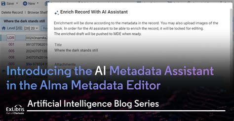 If you’re looking to streamline your digital asset management workflow, unlock the full potential of your digital collections, and stay ahead of the curve in the ever-evolving world of information management, Ex Libris AI Metadata Generator is definitely worth exploring. So go ahead, take the plunge, and discover how AI can transform the way you manage your digital assets. The future of metadata generation is here, and it’s powered by AI! By embracing this technology, you can ensure that your digital collections remain accessible, discoverable, and valuable for years to come. Remember to stay informed about the latest developments in AI and metadata standards, and to continuously evaluate and refine your metadata generation processes to maximize their effectiveness. The journey of digital asset management is an ongoing one, and Ex Libris AI Metadata Generator can be a valuable partner along the way.