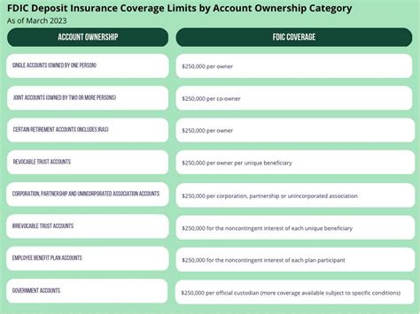 Want to protect more than \(250,000? Here's the secret: ***different ownership categories!*** You can have separate coverage for individual accounts, joint accounts, and even trust accounts. Each category gets its own \) 250,000 limit. To maximize your FDIC coverage, it’s essential to understand the different ownership categories and how they are insured. The FDIC provides separate coverage for single accounts, joint accounts, retirement accounts, and trust accounts. Single accounts are those held in one person’s name, such as a checking account or savings account. Joint accounts are owned by two or more people, and each co-owner is insured up to \(250,000. This means that a joint account with two owners is insured up to \) 500,000. Retirement accounts, such as IRAs, are also insured separately, but the rules can be complex. The FDIC provides coverage for certain types of retirement accounts, including traditional IRAs, Roth IRAs, and Simplified Employee Pension (SEP) IRAs. However, other types of retirement accounts, such as 401(k)s, are not insured by the FDIC. Instead, they are typically protected by the Employee Retirement Income Security Act (ERISA). Trust accounts can also provide additional coverage, depending on the type of trust and the beneficiaries. Revocable trust accounts, such as living trusts, are insured based on the number of beneficiaries. Each beneficiary is entitled to up to \(250,000 of coverage. This can be a useful strategy for families looking to protect larger sums of money. It’s important to properly document your trust and name your beneficiaries to ensure that your trust accounts are fully insured. The FDIC has specific rules for determining coverage for trust accounts, so it’s a good idea to consult with a financial advisor or the FDIC directly to ensure you understand the rules. Another way to maximize your FDIC coverage is to use different banks. By spreading your deposits across multiple insured banks, you can ensure that each deposit is fully insured up to \) 250,000. This can be a particularly useful strategy for businesses or individuals with large amounts of cash. It’s important to keep track of your accounts at each bank and ensure that you stay within the coverage limits. The FDIC also provides an Electronic Deposit Insurance Estimator (EDIE) tool on its website that can help you calculate your FDIC coverage. This tool allows you to enter information about your accounts and ownership categories and will calculate the amount of coverage you have at each bank. The EDIE tool can be a useful resource for ensuring that your deposits are fully insured. It’s also important to be aware of any changes in your account balances or ownership categories that could affect your FDIC coverage. If you open a new account, change the beneficiaries of a trust, or make significant withdrawals or deposits, you should review your FDIC coverage to ensure that you are still adequately protected. The FDIC provides resources and guidance to help depositors understand their coverage and make informed decisions about their accounts. You can visit the FDIC website or contact the FDIC directly for more information. Understanding FDIC insurance is an essential part of managing your finances and protecting your savings. By understanding the rules and maximizing your coverage, you can have peace of mind knowing that your deposits are safe.