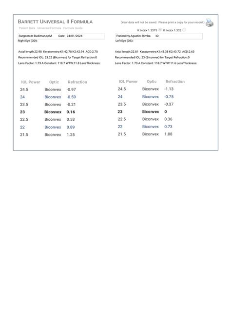 The IIRJ (Intraocular Implant Radius of the Junction) is a key component of the formula that further refines its accuracy. It estimates the effective lens position (ELP) more precisely, leading to improved refractive outcomes, particularly in complex cases. The IIRJ value is derived from sophisticated ray-tracing calculations and considers the unique characteristics of each individual eye. The formula works by analyzing large datasets of patient outcomes and identifying patterns and correlations between different biometric parameters and the postoperative refractive outcome. This allows it to continuously learn and adapt, improving its predictive accuracy over time. In essence, the IIRJ Barrett formula is a personalized approach to IOL calculation. It takes into account the unique characteristics of each patient’s eye to provide a more accurate prediction of IOL power. This leads to better visual outcomes, reduced refractive surprises, and increased patient satisfaction. So, the next time you hear about the IIRJ Barrett formula, don’t be intimidated. Just remember that it’s a powerful tool that helps ophthalmologists achieve the best possible visual results for their patients after cataract surgery. It’s like a recipe for perfect vision, carefully crafted to meet the unique needs of each individual eye.