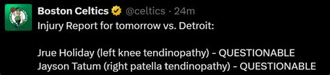 What’s up, basketball fanatics! Today we’re diving deep into a situation that has the Boston Celtics faithful holding their breath: Jayson Tatum is currently listed as questionable for their upcoming matchup against the Detroit Pistons due to right patella tendinopathy . This news, guys, is a pretty big deal, especially considering Tatum’s crucial role in the Celtics’ offense and their overall playoff aspirations. We’re talking about one of the league’s premier scorers and a guy who consistently delivers clutch performances. Any time he’s sidelined, it sends ripples through the team and impacts how they play. Let’s break down what this means for the Celtics, the Pistons, and what this specific injury entails. Understanding the nuances of ‘questionable’ status and the nature of tendinopathy will give us a clearer picture of the potential game-time decisions and the impact on the court. We’ll explore how the Celtics might adjust their strategy, who might step up in his absence, and what this could mean for the betting lines and fantasy basketball managers out there. So, grab your popcorn, and let’s get into the nitty-gritty of this developing story. The health of star players is always a hot topic, and Tatum’s status is no exception. We’ll aim to provide you with the most comprehensive and up-to-date information so you can stay in the know, all while keeping it casual and informative, just the way we like it!