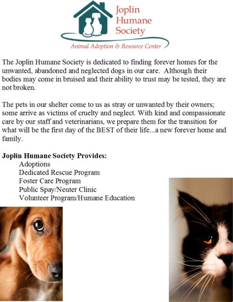 Hey guys! Ever wondered about the Joplin Humane Society ? This amazing organization in Joplin, Missouri, is doing incredible work for our furry, feathered, and scaled friends. They’re basically the superheroes of animal welfare in the area, working tirelessly to rescue, rehabilitate, and rehome animals in need. Whether you’re looking to adopt a new best friend, volunteer your time, or simply want to support a fantastic cause, the Joplin Humane Society is the place to be. They provide a safe haven for abandoned, neglected, and abused animals, giving them a second chance at a happy life. Their dedication is truly inspiring, and they rely on the generosity of the community to keep their doors open and their services running.