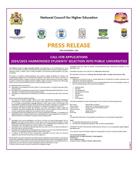 The Malawi National Council for Higher Education (NCHE) is the regulatory body responsible for overseeing higher education institutions and programs in Malawi. Their mission is to promote quality and relevance in higher education to contribute to national development. One of the ways they achieve this is by providing comprehensive information on accredited programs, guidelines, and policies through their official website. These resources are often available in PDF format, making them easily accessible for download and offline viewing. Whether you’re a prospective student researching program options, a current student seeking program details, or an educator looking for accreditation standards, NCHE’s website is your go-to source. They regularly update their website with the latest information, so it’s always a good idea to check back periodically for any changes or updates. Furthermore, NCHE also conducts workshops and seminars to disseminate information and provide guidance to higher education institutions and stakeholders. These events offer valuable opportunities to learn more about NCHE’s programs and initiatives, and to network with other professionals in the field. By actively engaging with NCHE and utilizing the resources they provide, you can stay informed and contribute to the advancement of higher education in Malawi.