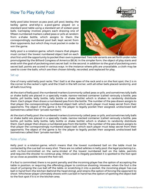 Alright, guys, let’s get down to the nitty-gritty: the Kelly Pool rules . Understanding these rules is absolutely crucial for enjoying the game and, more importantly, for winning! Don’t worry, it’s not super complicated, but there are a few key elements that make Kelly Pool distinct from other pool games. First off, you’ll need a standard set of 15 numbered pool balls, a cue ball, and what’s called a Kelly Pool shake bottle (or “pill bottle”) containing 15 numbered “pills” or “peas,” corresponding to the balls. This little bottle is where all the secretive fun begins! To start, all 15 object balls are racked in a standard triangle formation, with the 1-ball at the apex and the 15-ball in the center, or any other setup agreed upon, as long as the balls are tightly packed. The goal is simple: to be the player who legally pockets their secretly assigned numbered ball . But here’s the kicker: no one knows which ball is yours until it’s revealed at the end!