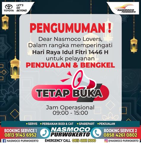 Ready to get your Toyota serviced? Here’s how to schedule an appointment with Nasmoco Purwokerto Service . They make the process super easy and convenient. You can start by visiting their official website. Most Nasmoco dealerships have a dedicated website where you can find service information, check availability, and schedule an appointment online. Look for the service section and fill out the online form with your car’s details and the service you need. If you’re not a fan of online forms, you can always give them a call. Find the contact number for Nasmoco Purwokerto, and dial it up. Explain your service needs to a representative, and they’ll help you book an appointment. It’s a quick and simple way to get things done, and you can also ask any questions you might have about their services.