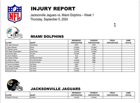 - Who is injured: Specific player names.