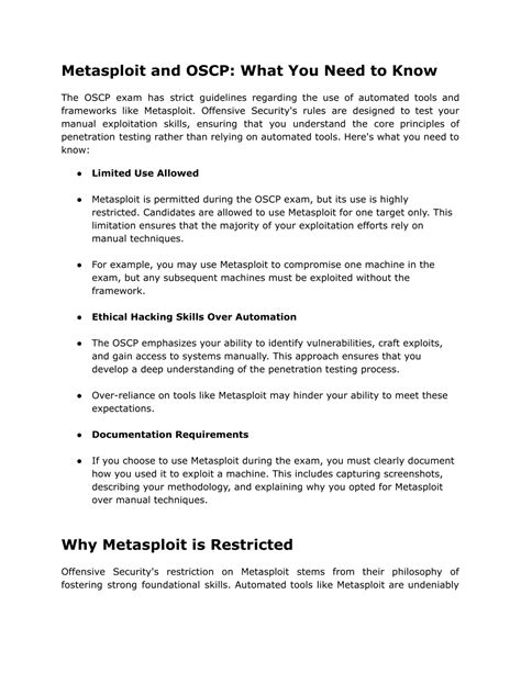 Now, here’s where it gets interesting. You are allowed to use Metasploit, but with significant restrictions. The OSCP exam limits the use of Metasploit’s automated exploit modules. This means you can’t just fire up a module and expect to gain access. You’ll need to demonstrate your ability to understand the vulnerability, craft your own exploit code (or modify existing ones), and use Metasploit as a framework to execute your exploits. The main point is to prove that you understand the “why” and “how” of the exploit, and not just the “what”. You’ll need to show that you’re capable of manually exploiting vulnerabilities. This restriction forces you to learn about the underlying vulnerabilities and how the exploits work. It pushes you to gain a deeper understanding of the concepts behind penetration testing.