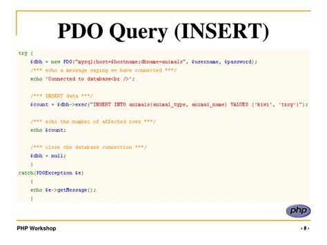 Error handling customization: While PDO::ERRMODE_EXCEPTION is the standard, you can also use PDO::ERRMODE_SILENT (which returns false on errors, requiring manual checks) or PDO::ERRMODE_WARNING (which raises PHP warnings). However, exceptions provide the most structured and robust error management.