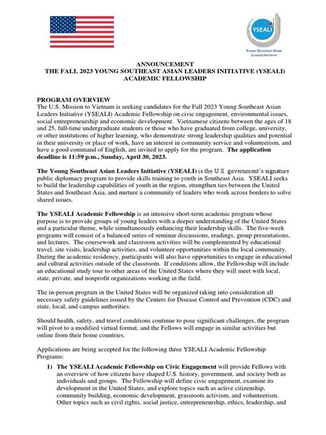 Hey everyone! Are you ready to dive into an incredible opportunity? Let’s talk about the Spring 2023 YSEALI Academic Fellows Program . This program is a game-changer for young leaders from Southeast Asia, offering a chance to study in the United States. Think of it as a launching pad for your leadership skills, cultural understanding, and global network. This comprehensive guide will help you understand every aspect of the program, from eligibility and application tips to what to expect during your fellowship.