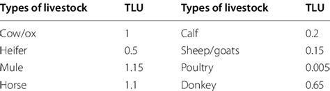 TLU = (Number of Animals of a Specific Type) x (TLU Conversion Factor for That Type)