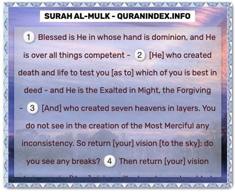 Surah Al-Mulk (سورة الملك), which translates to “The Sovereignty” or “The Dominion,” is the 67th chapter (surah) of the Quran. It comprises 30 verses (ayahs) and is considered a Meccan surah, meaning it was revealed during the Prophet Muhammad’s (peace be upon him) time in Mecca. This surah is renowned for its profound message about the sovereignty of Allah, His absolute power, and His meticulous creation. The very name, Al-Mulk , emphasizes the central theme of divine dominion and control over all aspects of existence. Let’s explore the key aspects of Surah Al-Mulk, including its themes, structure, and significance.