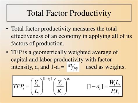 Now, let’s get down to the nitty-gritty – the TFP formula itself. While there isn’t one single, universally agreed-upon formula that everyone uses in every situation, the most common way to conceptualize and measure TFP is through its relationship with output and inputs. The core idea comes from production functions, like the Cobb-Douglas production function, which is a staple in economics. In its simplest form, a production function shows how inputs are transformed into output. For example, output (Y) might be a function of labor (L) and capital (K): Y = f(L, K). But this equation doesn’t account for that magical efficiency boost we talked about. So, we introduce TFP, often denoted by ‘A’, to capture this. A common representation looks something like this: Y = A * F(K, L) . Here, ‘Y’ is your total output, ‘K’ is capital, ‘L’ is labor, and ‘F(K, L)’ represents the combined contribution of capital and labor to output. ‘A’ is your Total Factor Productivity . It multiplies the output that would have been produced with just the given capital and labor alone. If ‘A’ is greater than 1, it means you’re getting more output than expected from your inputs. If ‘A’ is less than 1, well, things aren’t as efficient as they could be. To actually calculate TFP, economists often look at the growth rates . The growth rate of TFP (ΔA/A) is typically estimated as the growth rate of output (ΔY/Y) minus a weighted average of the growth rates of inputs (capital and labor). So, if we have output growth, capital growth, and labor growth, we can estimate how much of the output growth is not explained by the input growth. This unexplained portion is our TFP growth. The weights used are usually the shares of capital and labor in total income. For example, if labor’s share of income is 60% and capital’s share is 40%, the TFP growth would be: TFP Growth ≈ Output Growth - (0.60 * Labor Growth) - (0.40 * Capital Growth) . This equation is key because it allows us to quantify the contribution of efficiency and technology to economic expansion. It’s a way to measure how smart we’re working, not just how hard.
