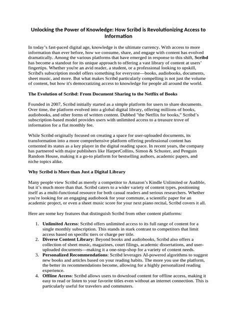 Let’s talk about Scribd’s access model. Generally, it operates on a subscription basis, which differs from some platforms that offer entirely free downloads. However, there are aspects that allow for more options. Here’s a quick rundown of how it works: Subscription Access: Scribd offers a monthly subscription that provides unlimited access to its library of documents, books, audiobooks, and more. This is the primary way to access most of the content. Free Trials: Often, Scribd offers free trial periods, allowing new users to explore the platform and access content without an initial payment. This is a great way to see if Scribd meets your needs. Uploading Documents: Users can upload their documents to Scribd and make them accessible to others. In some cases, uploading documents can provide access to certain content. Limited Free Access: Sometimes, Scribd might offer limited free access to certain documents or previews of documents. This varies, so it’s worth checking each document individually. The Download Question: The ability to directly download PDFs depends on the specific document and your subscription status. With a subscription, you typically have broader access and can download many documents. Without a subscription, downloads are usually restricted. Scribd’s goal is to balance access with supporting content creators. The subscription model helps compensate the creators who share their work on the platform. The platform’s terms of service and copyright policies are also critical. Always respect these rules to ensure ethical and legal access to the content. Always ensure that the resources you access are in compliance with the rules and guidelines.